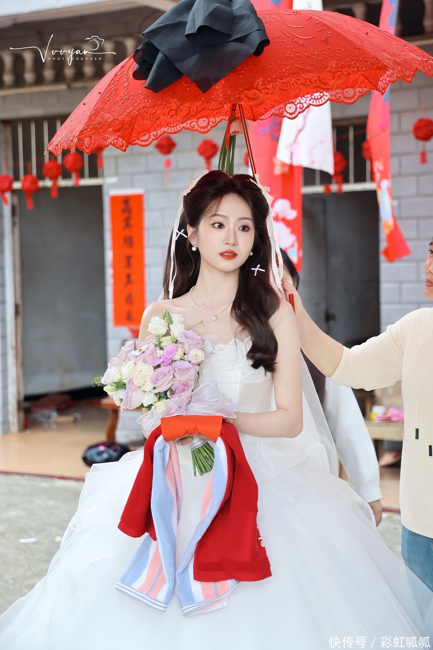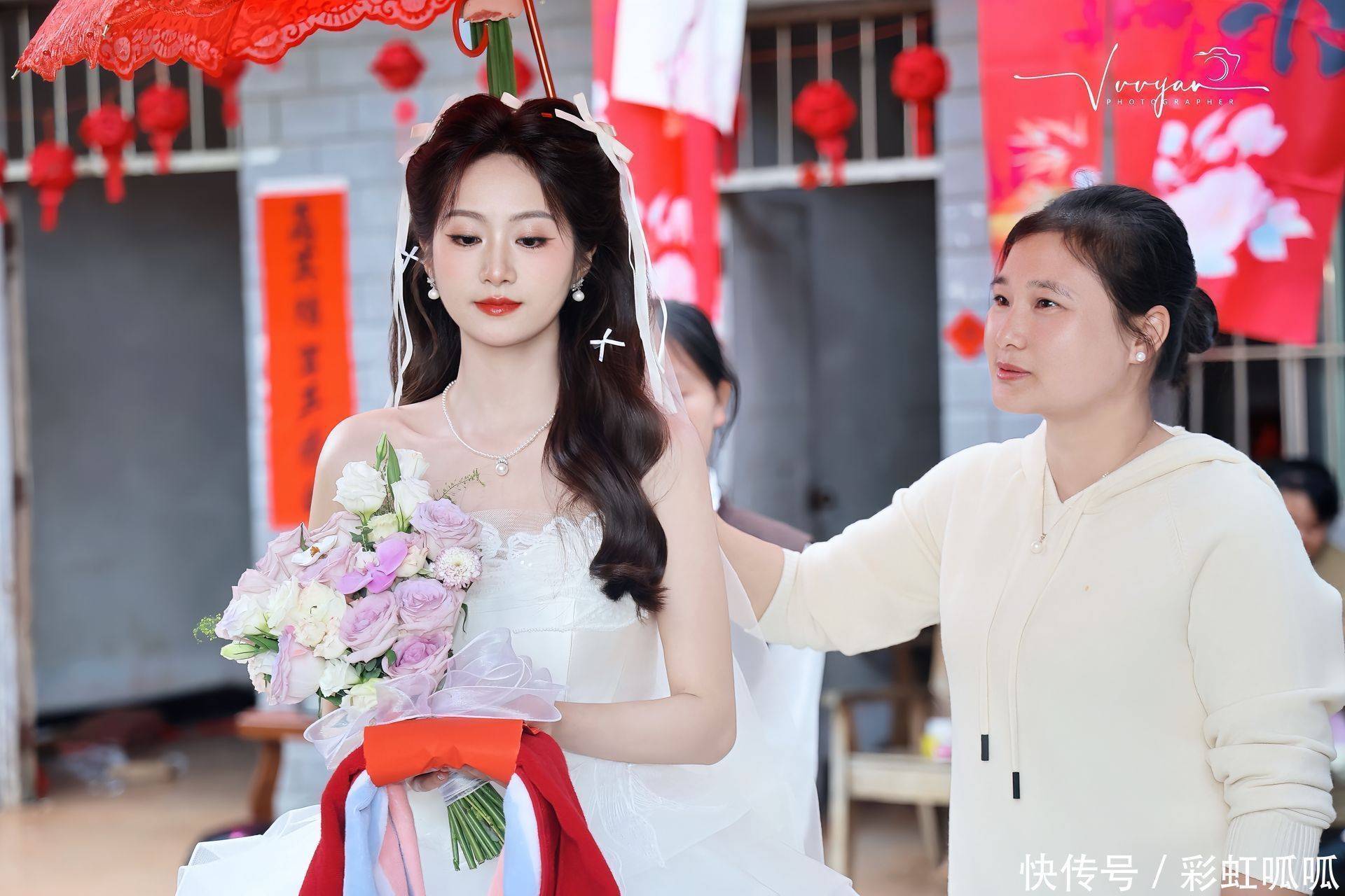 新娘穿着一袭白色露肩婚纱,裙摆被村里的小姑娘轻轻提着,手里捧着一束紫色桔梗花,花瓣上还带着清晨的露珠。